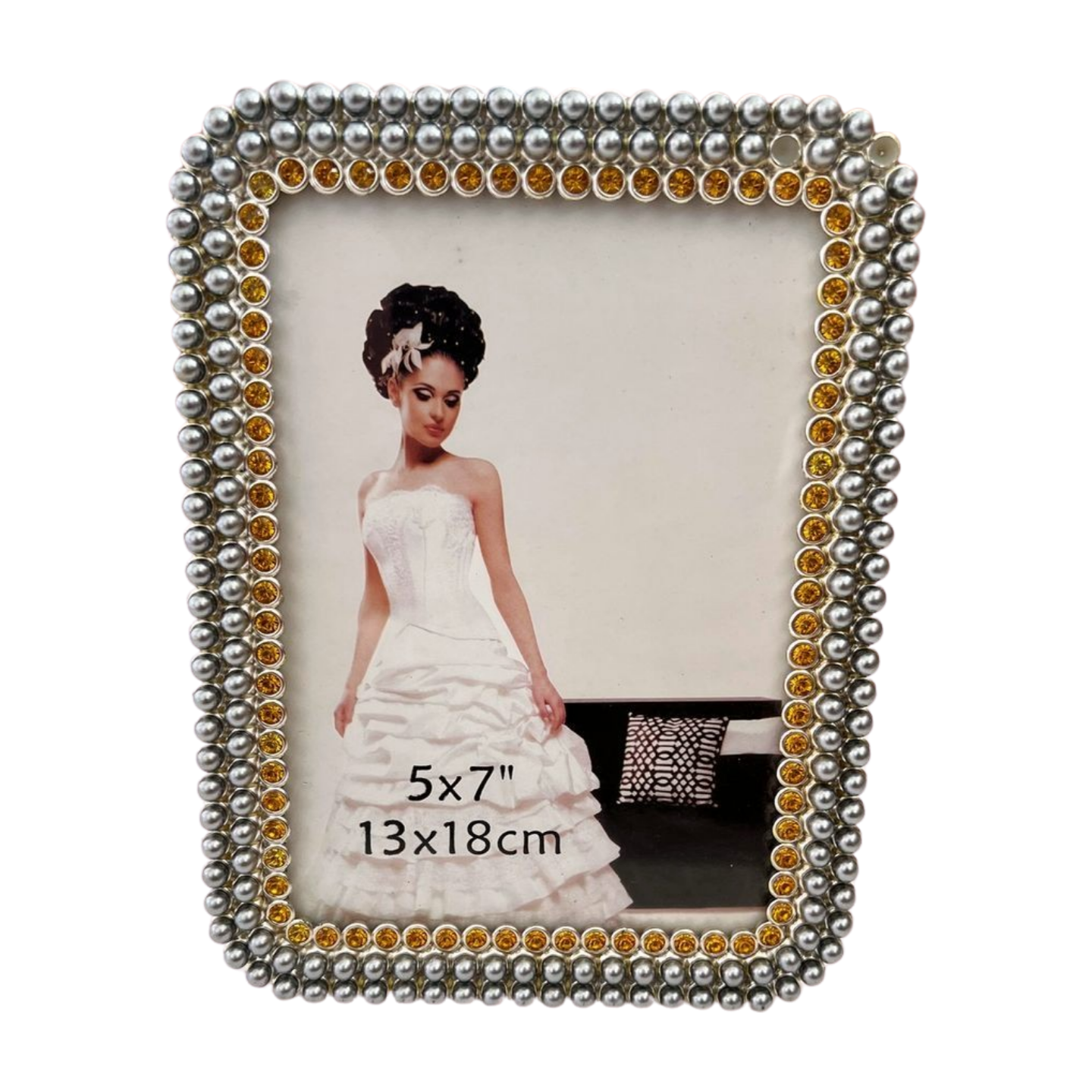 Add a touch of elegance to your memories with this uniquely designed photo frame. Crafted with a striking beaded border in metallic silver and accented with golden crystal embellishments, it beautifully combines luxury and style. Perfectly sized for a 5×7″ (13×18 cm) photograph, this frame is ideal for showcasing wedding portraits, family pictures, or special moments. Its distinctive design makes it not only a functional piece but also a decorative accent that enhances any home or office décor. A thoughtful and timeless gift choice for loved ones on special occasions.