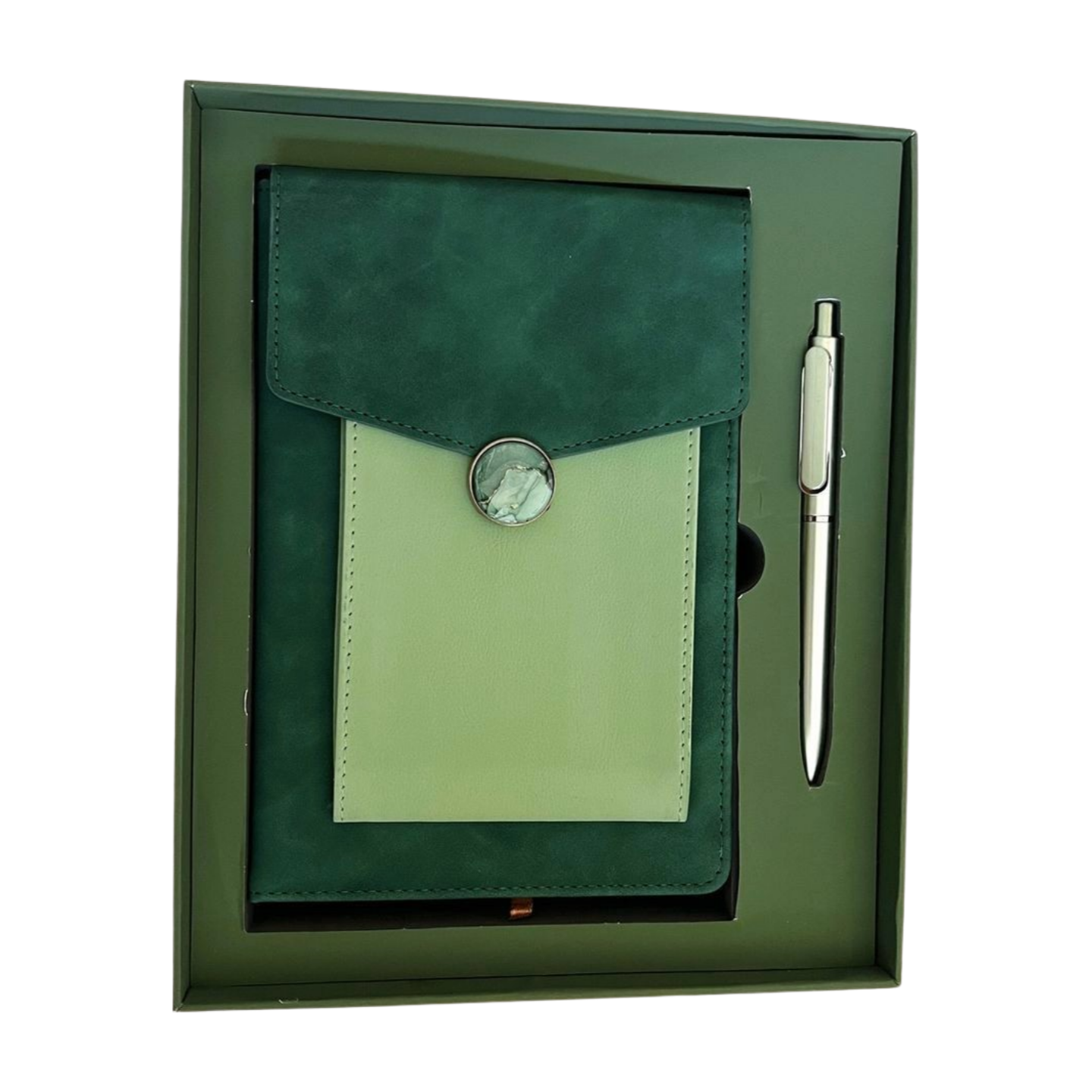 Elevate your writing experience with this exclusive diary, featuring a luxurious green velvet cover and a unique marble-inspired clasp for a touch of elegance. The diary’s compact design makes it perfect for daily journaling, note-taking, or planning on the go. Paired with a sleek, metallic pen that glides smoothly across each page, this set combines sophistication and practicality. Beautifully presented in a matching gift box, it’s an ideal choice for gifting to professionals, students, or anyone who appreciates refined stationery and timeless style.