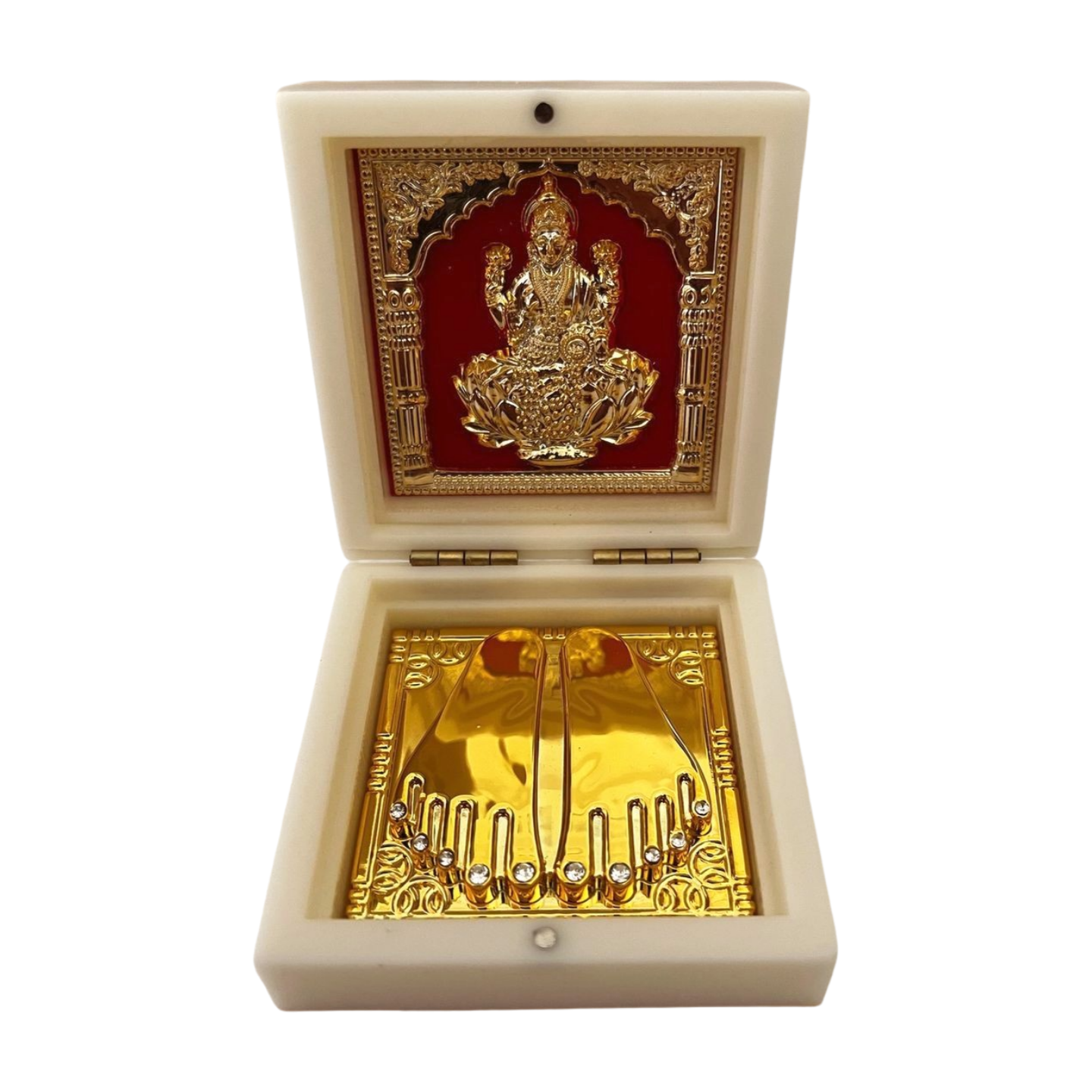 Invite prosperity, wealth, and divine blessings into your home with this exquisite Gold-Plated Goddess Lakshmi Charan Paduka Box. Beautifully crafted, the box features a finely detailed idol of Goddess Lakshmi on the inner lid, seated gracefully on a lotus, symbolizing abundance and good fortune.
