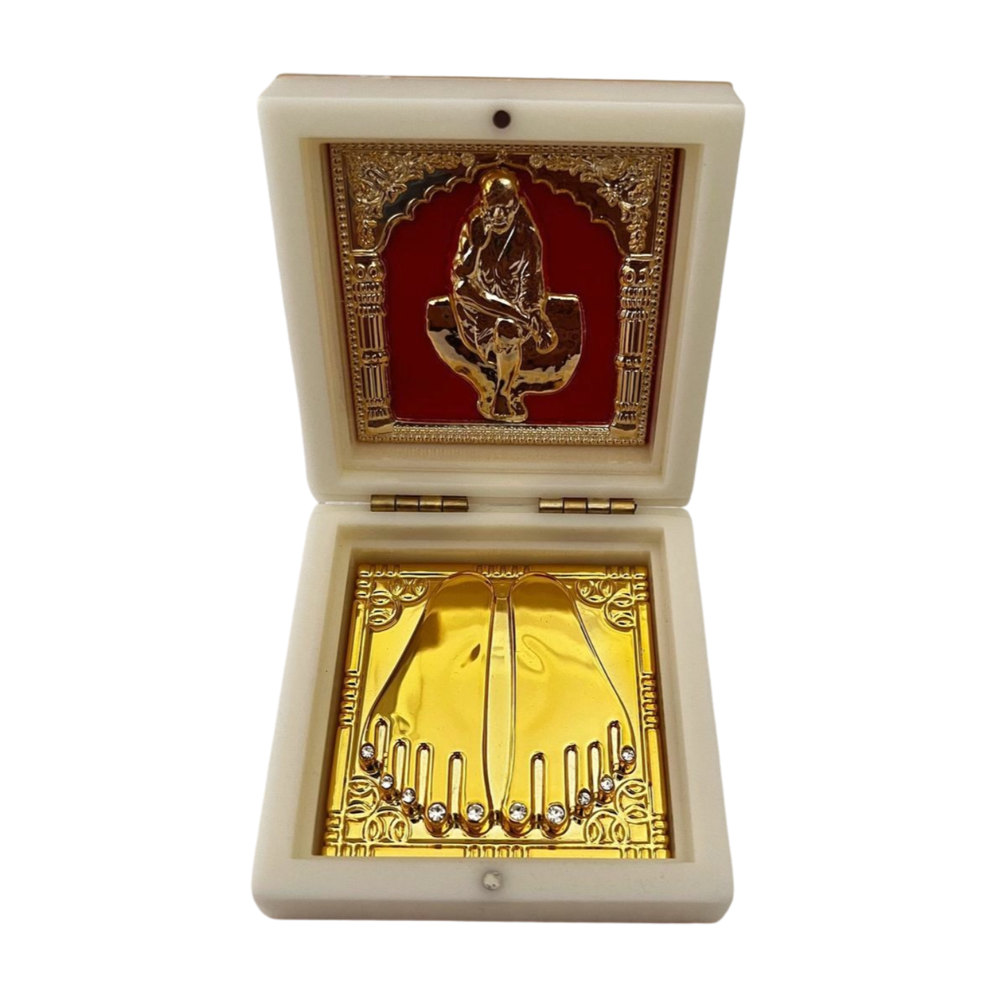 Invite divine blessings and positivity into your home with this beautifully crafted Sai Baba Charan Paduka Box. Designed with intricate detailing, the box features a finely embossed idol of Sai Baba on the inner lid, symbolizing peace, devotion, and spiritual guidance.