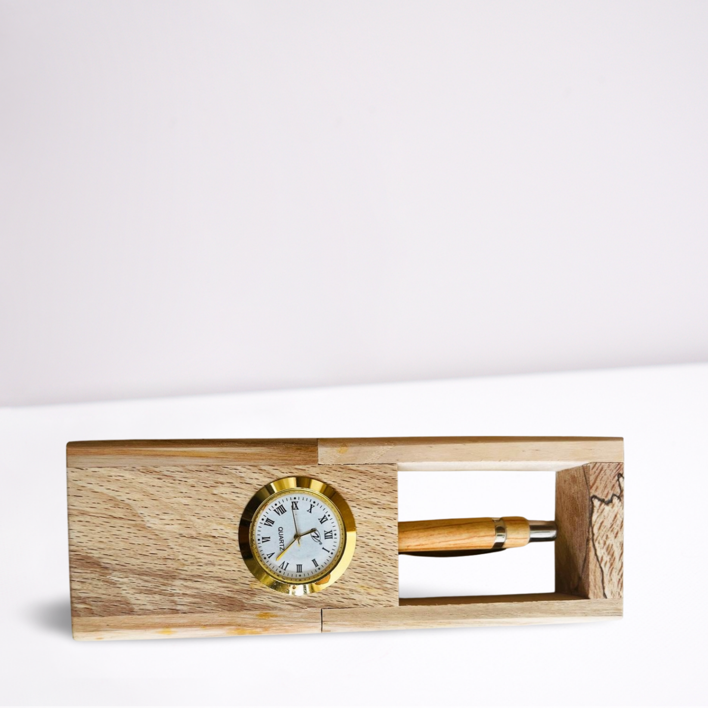 Showcase timeless elegance with this Wooden Executive Gift Set, featuring a beautifully crafted wooden desk organizer with an integrated clock, a matching wooden pen, and a sleek wooden key chain. The desk organizer adds a touch of sophistication to any workspace, while the classic analog clock ensures punctuality with style. The smooth wooden pen offers a comfortable writing experience, and the key chain provides a practical yet refined accessory for everyday use. Presented in a premium gift box, this set is perfect for corporate gifting, special occasions, or as a thoughtful gesture for professionals who appreciate quality and natural design.